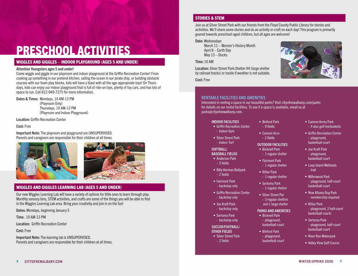 RENTABLE FACILITIES AND AMENITIES Interested in renting a space in our beautiful parks? Visit cityofnewalbany. com / parks for details on our rental facilities. To see if a space is available, email us at parks @ cityofnewalbany. com.